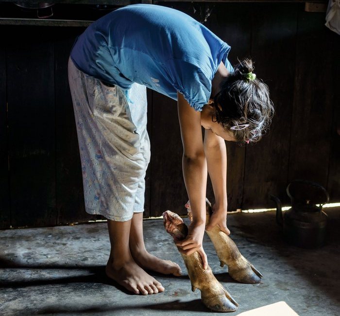 12-летняя Беслинда Кхонгдуп держит в руках коровьи ноги, из которых кхаси варят суп. Хотя большинство индийцев является индуистами, и коровы для них священны, жители Маулиннонга — христиане и, следовательно, могут есть говядину.