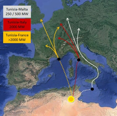 ЕС уже рассматривает возможность присвоения приоритетного статуса подводному кабелю, соединяющему Тунис с Италией, и TuNur ожидает, что строительные работы начнутся к 2019 году на юго-западе Туниса. «Мы намерены начать доставку электроэнергии на Мальту к 2021 году», — сказала Сара. «В следующем году может быть проложен первый из двух кабелей в Италию, а к 2024 году доставлять энергию смогут и во Францию» — добавил Сара. Компания также готова поставлять электроэнергию в пределах Туниса, который и сам сталкивается с нехваткой электроэнергии.
