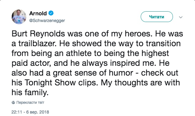 На известие о смерти Рейнольдса отреагировал американский актер Арнольд Шварценеггер.