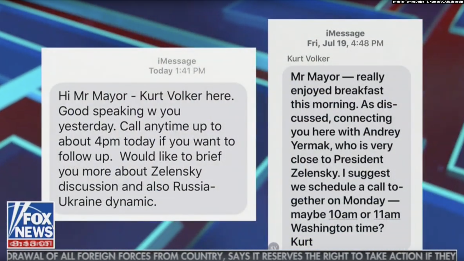 Согласно другому текстовому сообщению, Волкер, предложил Джулиани проконсультировать его о Зеленском и динамику российско-украинских отношений. Джулиани настаивает, что он действовал от имени Госдепартамента США.