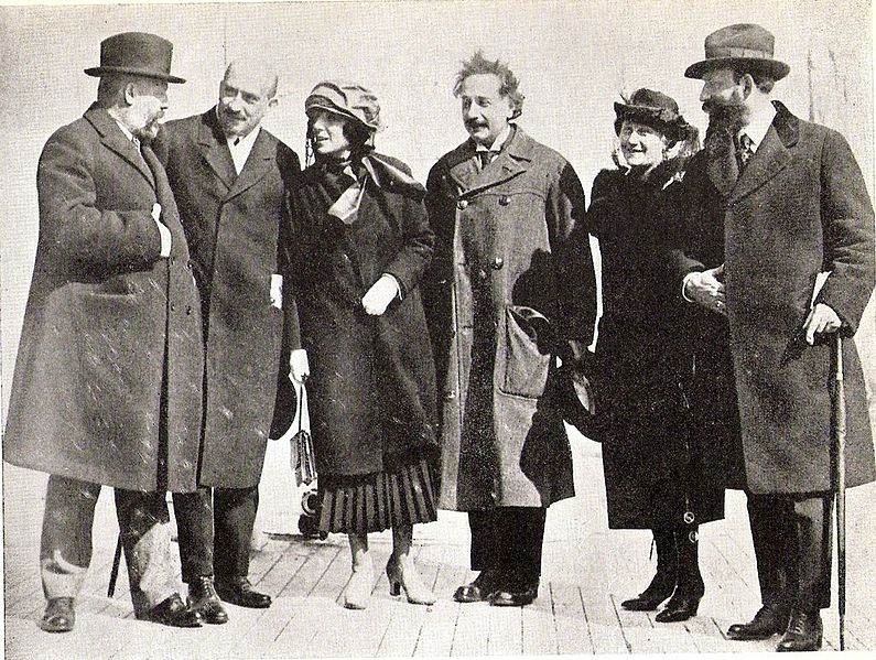 Альберт Эйнштейн и его жена Эльза Эйнштейн в составе сионистской делегации в США в 1921 году. На фото также: будущий президент Израиля Хаим Вейцман, его жена Вера Вейцман, Менахем Усышкин и Бен-Цион Мосинзон. Фото: Википедия